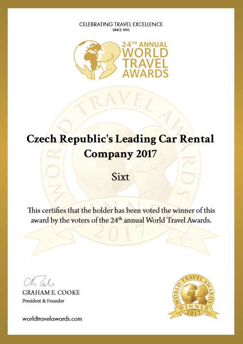 Praha, pátek 13.října 2017 – České zastoupení autopůjčovny SIXT bylo oceněno titulem Czech Republic´s Leading Car Rental Company pro rok 2017. Toto ocenění je udělováno v rámci prestižního mezinárodní hodnocení firem v cestovním ruchu. Podpis Grahama Cooka pod oceněním WORLD TRAVEL AWARDS 2017 je dosud nejvyšším ohodnocení kvality služeb a autoparku českého Sixtu.
